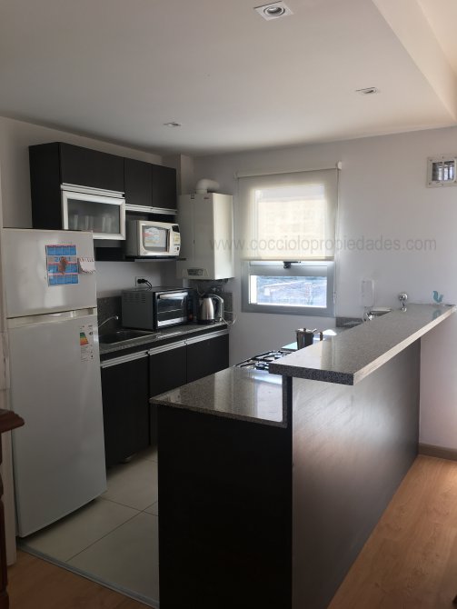 Cocina a continuación con muebles bajo mesada y alacena con barra desayunadora.