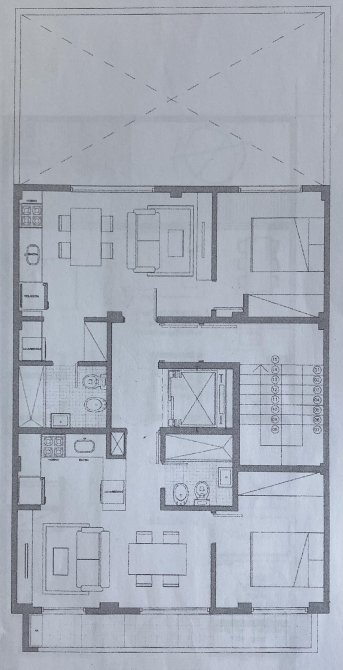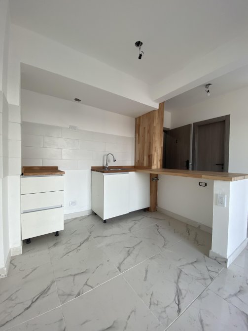 Cocina completa con muebles bajo mesada y alacena. Barra desayunadora. Espacio para lavarropas.