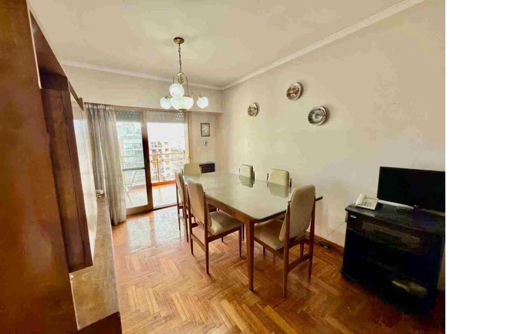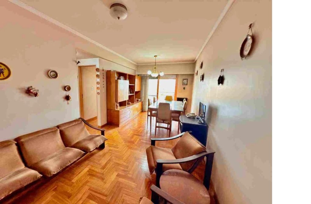 Living comedor de 6 x 3.20 con pisos de parquet con salida al balcón.