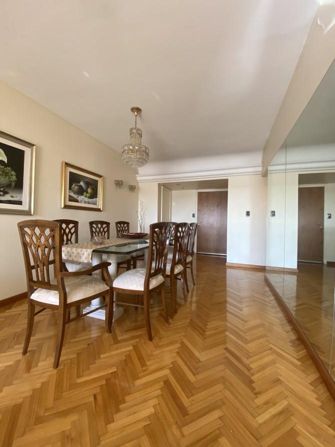 Ingreso principal por amplio living comedor con pisos de parquet y salida al balcón con vista abierta hacia la Plaza Alsina.