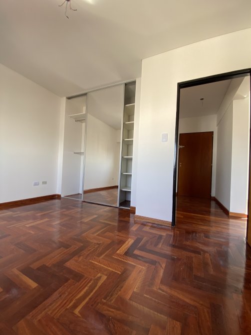 Dormitorio con pisos de parquet y placard.