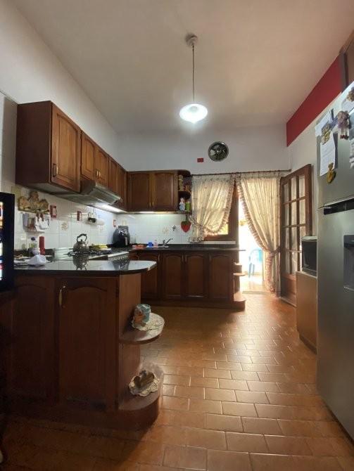 Cocina comedor de amplias medidas con muebles bajo mesada y alacena y salida al patio.